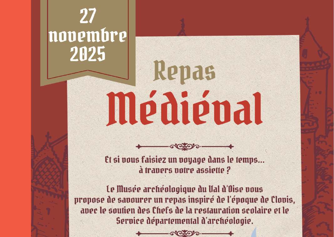 Le Musée archéologique du Val d’Oise, en partenariat avec les Chefs de la restauration scolaire et en association avec le Service départemental d’archéologie du Val d’Oise (SDAVO), organise cette année un repas archéo-historique consacré au Moyen Âge, en lien avec les programmes scolaires. L’événement se tient le jeudi 27 novembre 2025. À cette occasion, les cuisines départementales concoctent un menu de saison inspiré des recettes médiévales, plus précisément de l’époque mérovingienne, en préfiguration de la prochaine exposition du musée : « Le monde de Clovis ». Courge, roquette, céréales, fruits secs, thym, romarin ou cameline viendront ainsi sublimer des ingrédients familiers des collégiens tels que le poulet, le saumon ou les légumes racines.